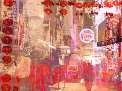 eine Basis, aus der Bilder-welten entstehen in schnellen, vielfältigen sequentiellen und auch parallelen Arbeits-schritten. Analoge Elemente, digitalisierte Fotos und Teile solcher werden verfremdet, abstrahiert und wieder zu neuen Werken zusammengefügt.